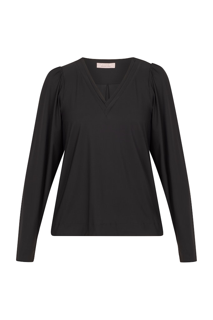 Top van Studio Anneloes in travel kwaliteit met lange pofmouwen en een V-hals. Materiaal: Polyamide 75%| elastan 25%