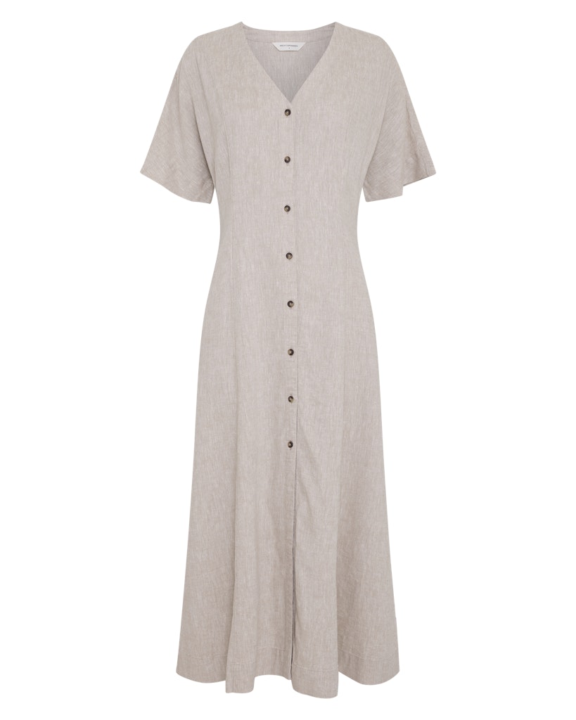 Linnen A-lijn jurk van Msch Copenhagen met korte aangeknipte mouwen, V-hals, doorlopende knoopsluiting en twee steekzakken.